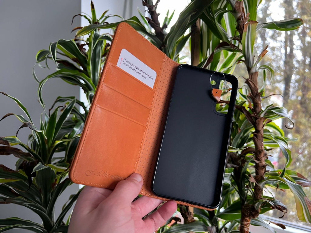 Wallet Cases müssen unserer Meinung einfach aus echtem Leder sein. Leider ist es nicht so einfach, etwas abseits von Kunstleder zu finden, ohne das Portemonnaie weit öffnen zu müssen. Das Problem bei Kunstleder ist, dass es nicht gut altert. Sobald die äußere Beschichtung Kratzer oder Risse bekommt, leidet das gesamte Aussehen des Galaxy S22. Aus diesem Grund haben wir uns auf die Suche nach einem hochwertigen Wallet aus Echtleder gemacht, das zudem noch bezahlbar ist. Die Shieldon-Wallets schlagen mit ca. 31 € zu Buche, was deutlich unter den Original-Wallets von Samsung liegt.
