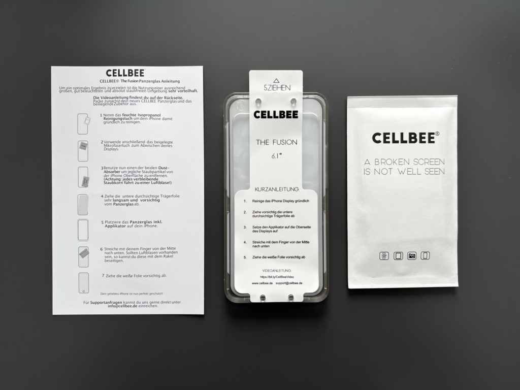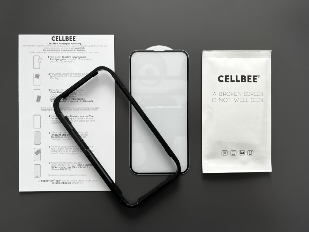 Glücklicherweise legt Cellbee bei all ihren Panzergläsern eine sehr ausführliche Anleitung bei, zudem stellen sie Videos zur Installation bereit.
