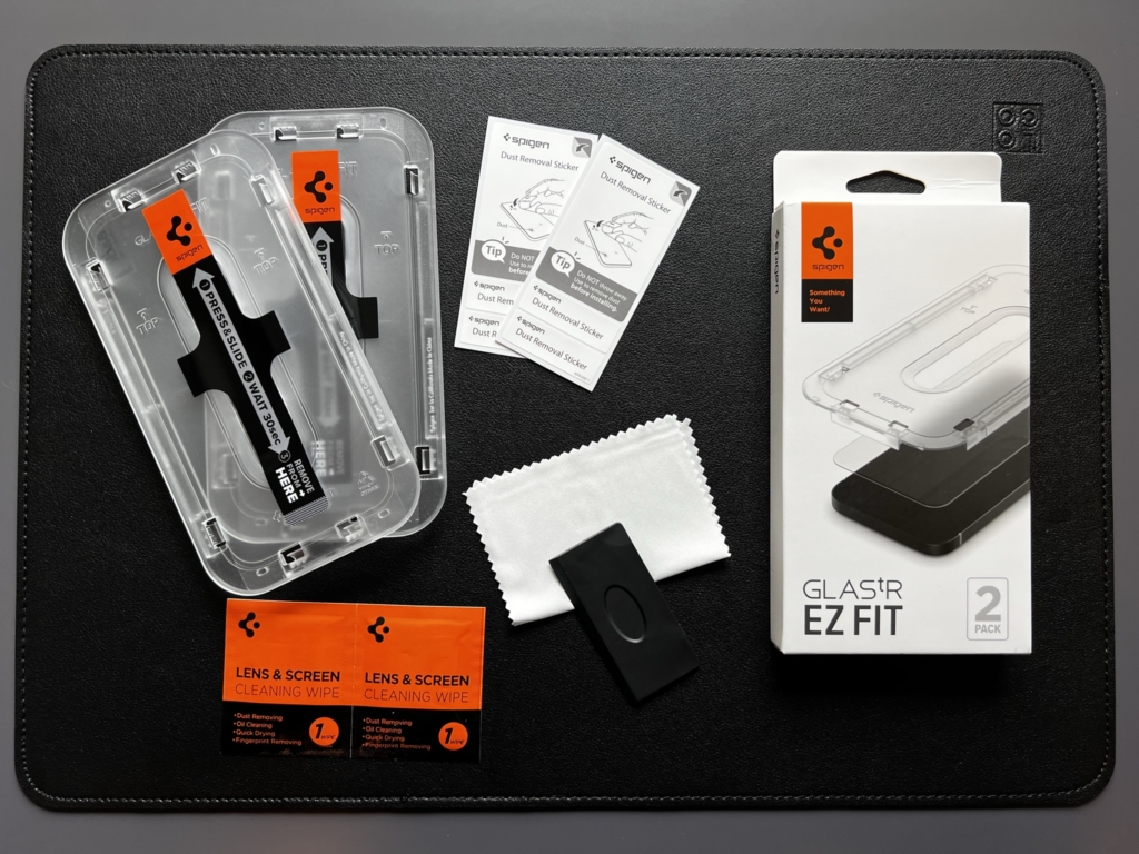 Lieferumfang des Glas.tR EZ Fit Panzerglases für das iPhone 14 Pro.