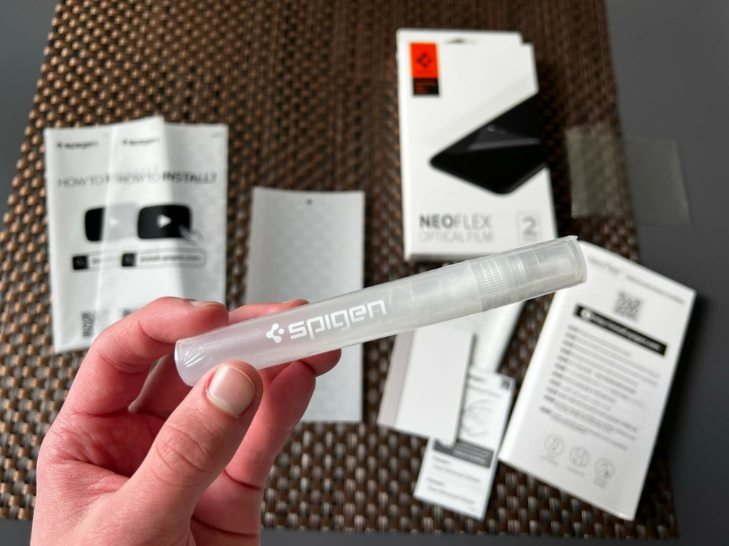Bei der NeoFlex-Folie für das Galaxy S22 Ultra gibt es keinen Montagerahmen, da die elastische Folie darin nicht halten würde. Stattdessen sprühen wir etwas von dem mitgelieferten Spray auf das Display auf und benetzen es damit. Anschließend legen wir die Folie auf. Durch die Feuchtigkeit können wir diese ohne Probleme für mehrere Sekunden verschieben und sicherstellen, dass die Folie korrekt platziert wurde. Die NeoFlex-Folie kann in diesem Zustand mit dem Spatel auch an die Rundungen der Edges angepasst werden. Nachdem die Feuchtigkeit verdampft ist, habt ihr auch bei der Folie einen perfekten Schutz an eurem Galaxy S22 Ultra. Sollte es noch Blasen geben, können diese ebenso ausgestrichen werden.